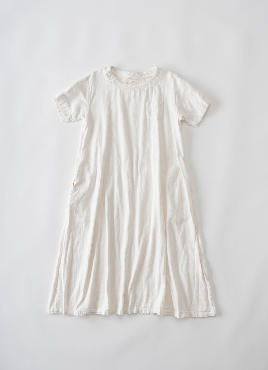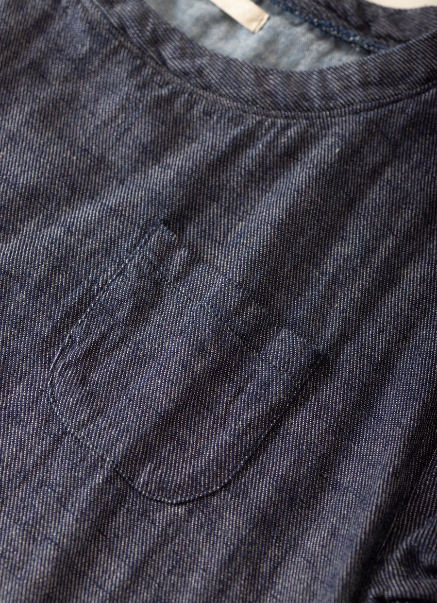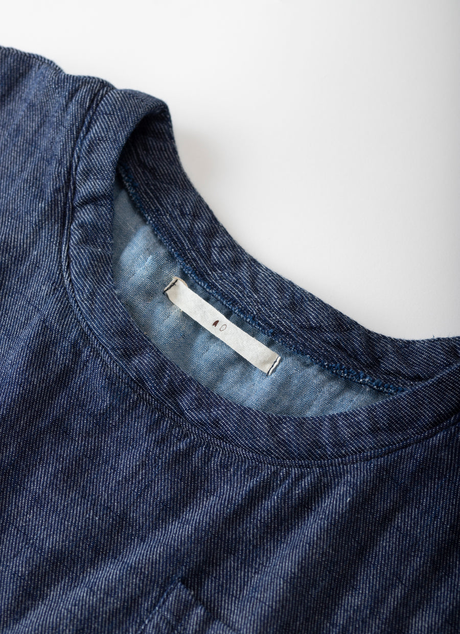 見た目はしっかりデニムなのに軽くてふかふか、やわらかい着心地が魅力の生地を使用しています。大きなTシャツをイメージして、半袖・胸元にポケット付き。